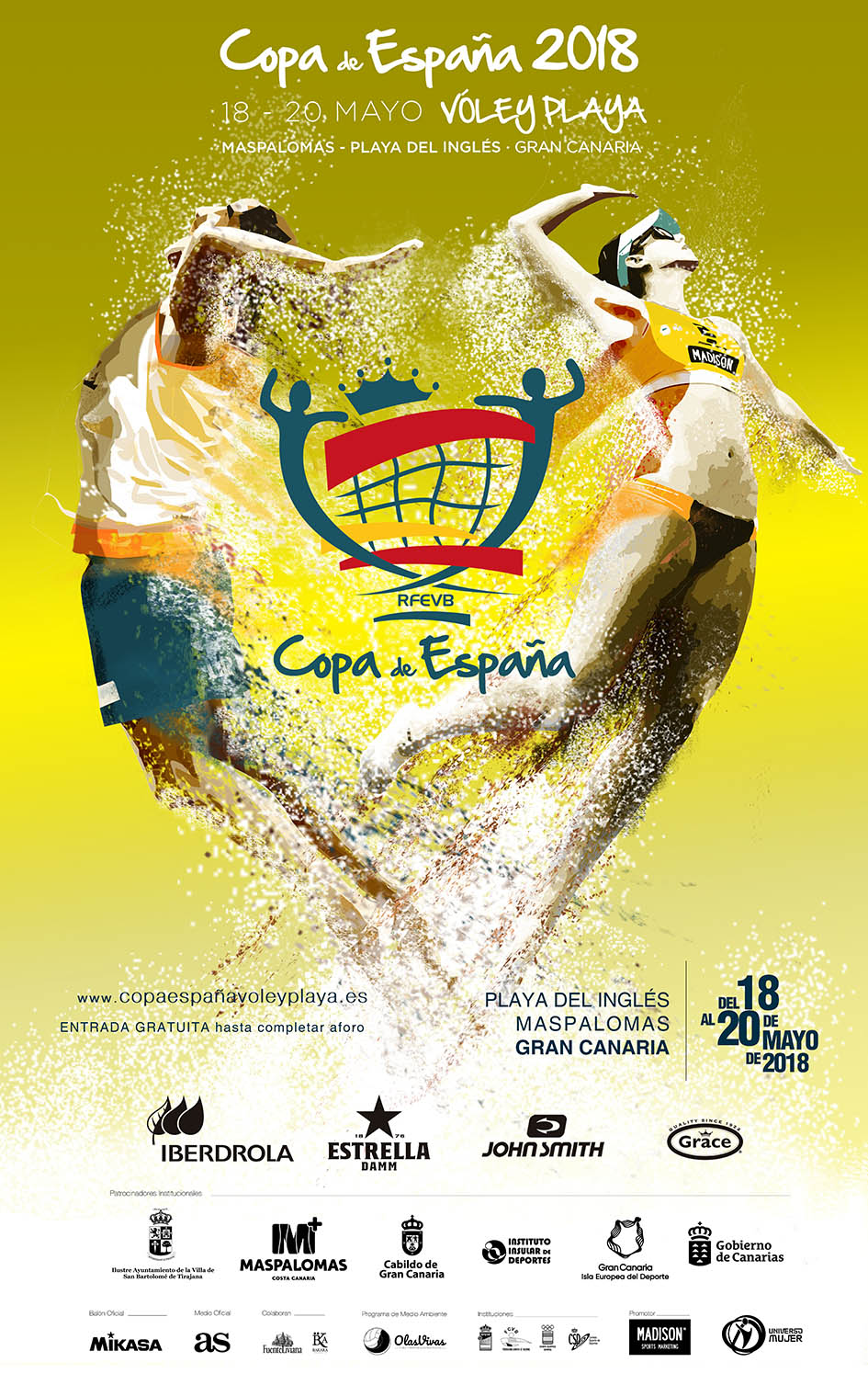La celebración de la primera edición de la Copa de España de Vóley Playa que se disputará durante los días 18, 19 y 20 de mayo en la playa del Inglés, en la localiadad de Maspalomas (Gran Canria). La localidad se ha convertido en el centro neurálgico del deporte al aire libre gracias a la calidad de sus playas y al magnífico clima que reina en el archipiélago canario durante todo el año. Este torneo es una atractiva oportunidad para disfrutar de los mejores jugadores y de un espectáculo del máximo nivel. Acudirán a la cita las 8 mejores parejas del ranking de la RFEVB, jugadores tanto de la categoría masculina como de la femenina, ya sean nacionales o internacionales se verán las caras para convertirse en los primeros campeones de la Copa de España de vóley Playa.