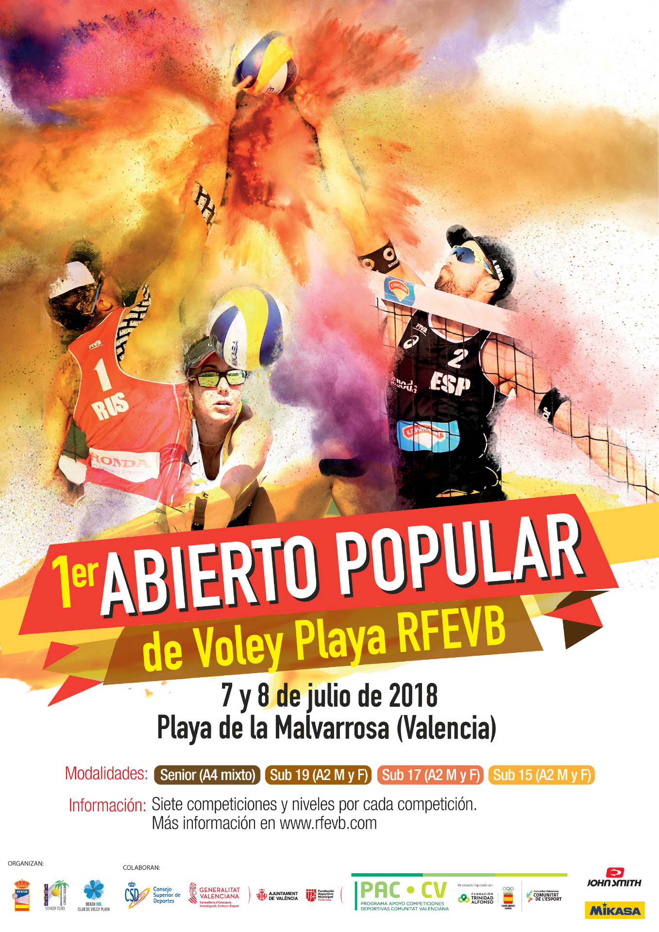 Para la categoría senior, se pretende una competición diferente, más 'informal y popular' con referencia al formato olímpico del Voley Playa. Se disputará en formato A4 y mixto, siendo obligatorio 2 deportistas por género en campo. En este caso la licencia federativa no será obligatoria, los participantes pueden agruparse de forma libre y no será necesaria la participación por club. En función de los equipos participantes por categoría se podrán establecer hasta 3 niveles en cada una de las cuatro categorías. De esta manera los equipos podrán seleccionar el nivel en el que quieren competir. Esta primera edición del "Abierto Popular de Voley Playa RFEVB" se celebrará en la playa de la Malvarosa de Valencia, durante los días 7 y 8 de julio de 2018. La ciudad de Valencia con su privilegiado entorno y sus magníficas instalaciones son ideales para que pases un genial y deportivo fin de semana.